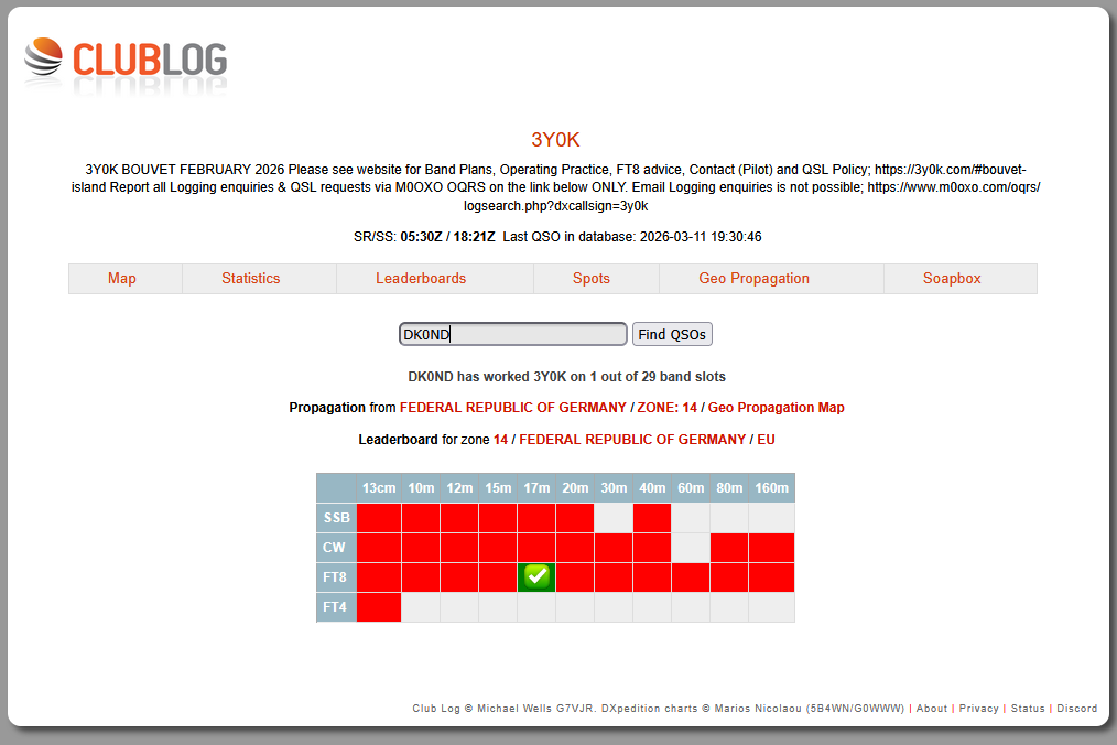 Mehrere Versuche über mehrere Tage und mehrere Bänder brachten am 11.03.2026 den Erfolg. Für unsere Klubstation und mich. Vermutlich eine einmalige Verbindung. Weitere Informationen: http://3y0k.com